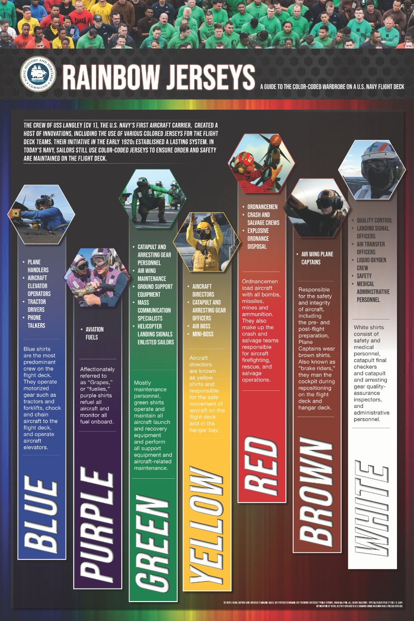 In the aviation world on an aircraft carrier, we had green shirts in the maintenance department. Usually, the squadrons wore them. I worked in the maintenance department right off the hanger deck, in the forward part of the ship. We did not have to wear these green shirts. We wore coveralls. We were the outliers there, for sure.